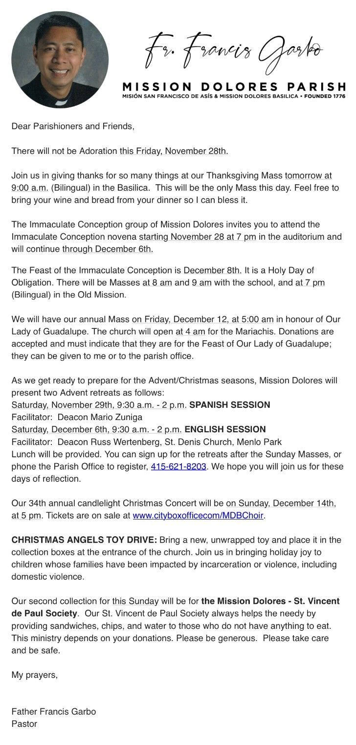 True to its origins, the Basilica Parish of Mission Dolores reflects the remarkable diversity and vibrancy of modern San Francisco. Located at the crossroads of the City's Mission District, Castro District, the Lower Haight, Noe Valley, and Upper Market Street neighborhoods, Mission Dolores parishioners come from an enormous array of cultures, places, and backgrounds to worship together.