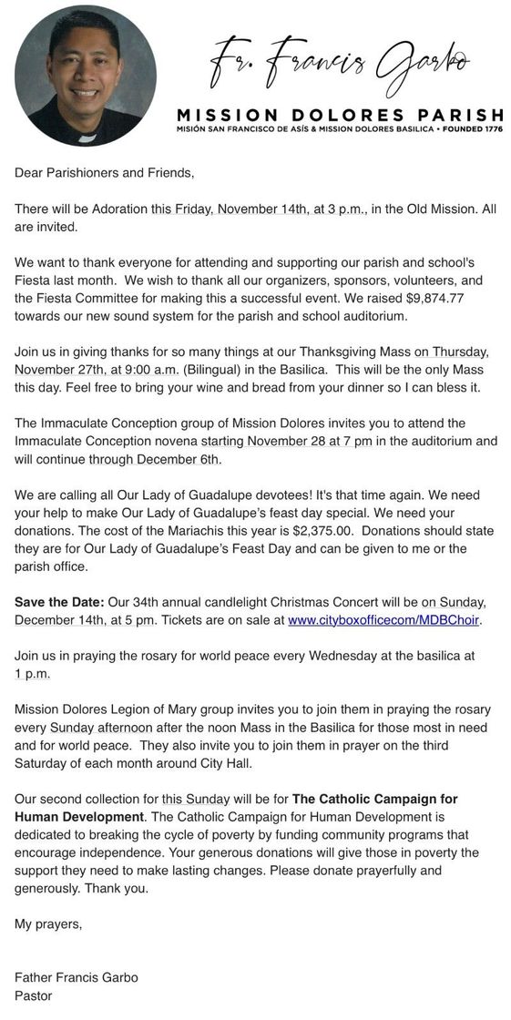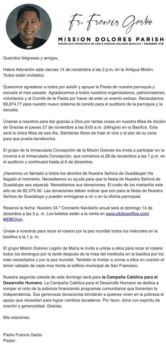We want to thank everyone for attending and supporting our parish and school's Fiesta last month. We wish to thank all our organizers, sponsors, volunteers, and the Fiesta Committee for making this a successful event. We raised $9,874.77 for our new sound system for the parish and school auditorium.