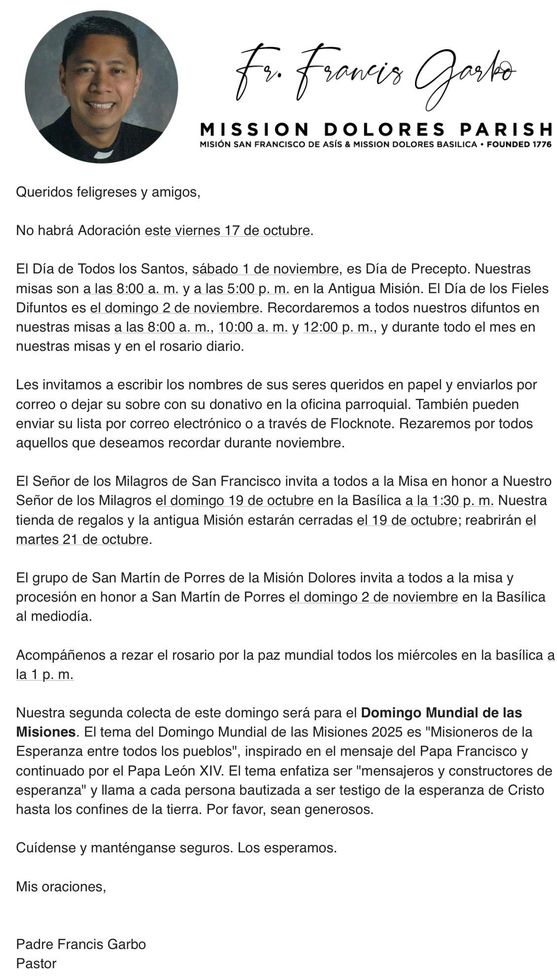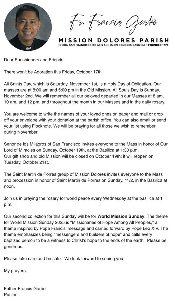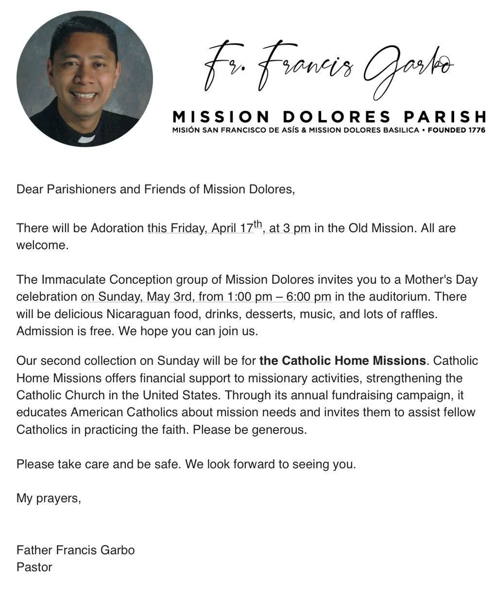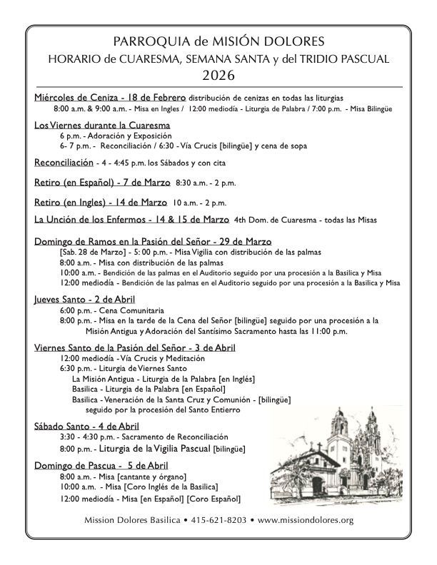 True to its origins, the Basilica Parish of Mission Dolores reflects the remarkable diversity and vibrancy of modern San Francisco. Located at the crossroads of the City's Mission District, Castro District, the Lower Haight, Noe Valley, and Upper Market Street neighborhoods, Mission Dolores parishioners come from an enormous array of cultures, places, and backgrounds to worship together.