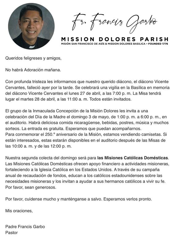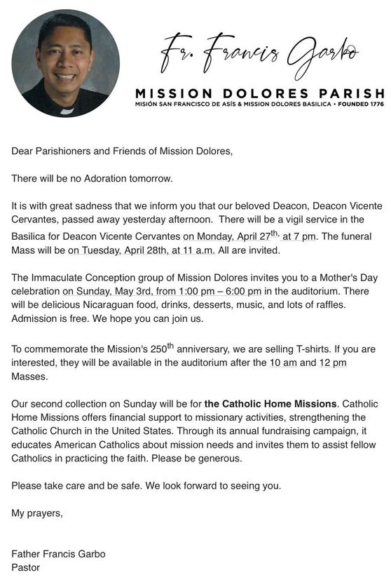 THESE MASSES WILL ALSO BE LIVE STREAMED - Mission Dolores Facebook Page: (https://www.facebook.com/missiondoloressf/videos/) & Parish Website (https://www.missiondolores.org/)