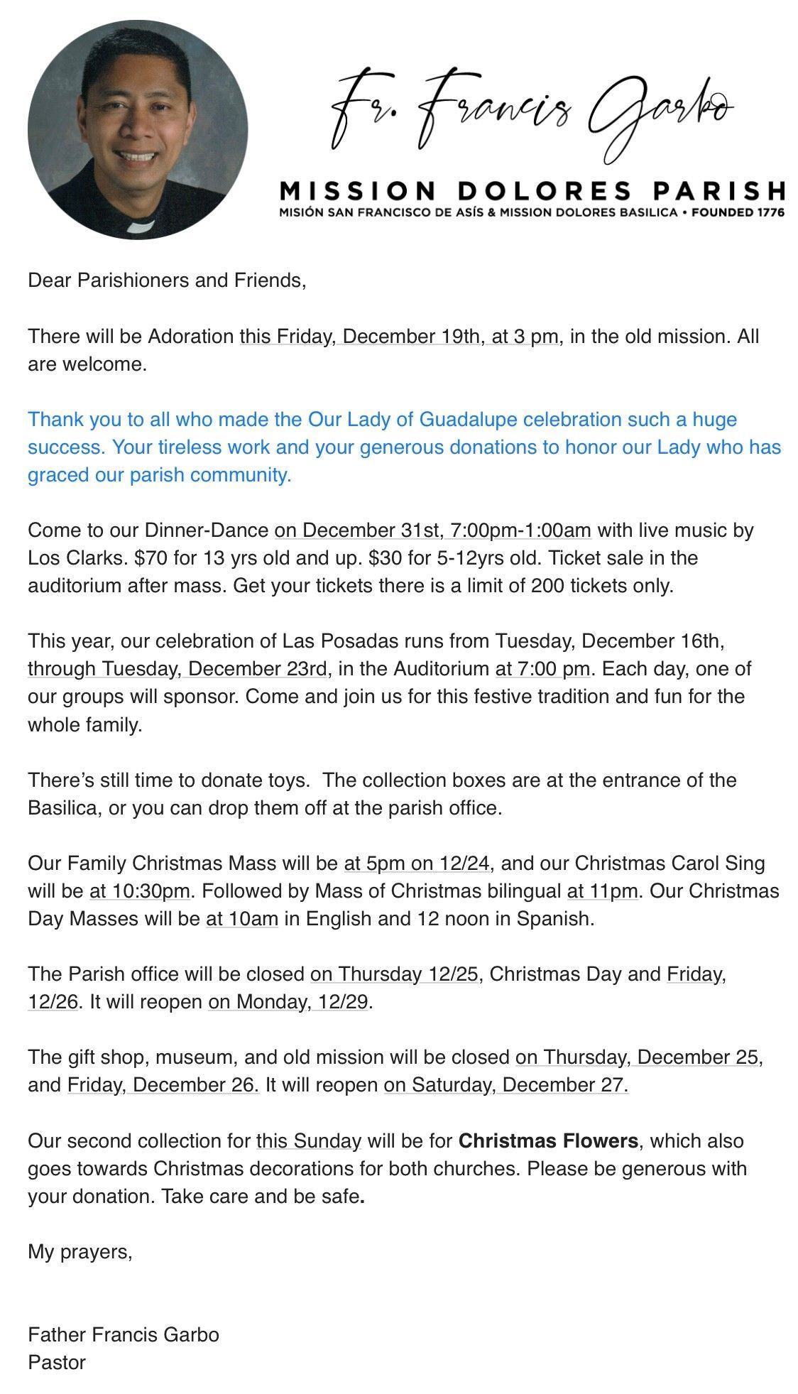 True to its origins, the Basilica Parish of Mission Dolores reflects the remarkable diversity and vibrancy of modern San Francisco. Located at the crossroads of the City's Mission District, Castro District, the Lower Haight, Noe Valley, and Upper Market Street neighborhoods, Mission Dolores parishioners come from an enormous array of cultures, places, and backgrounds to worship together.